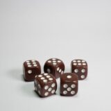 Each set includes 5 brown 16mm acrylic rounded dice with white pips and a velvet carry bag.