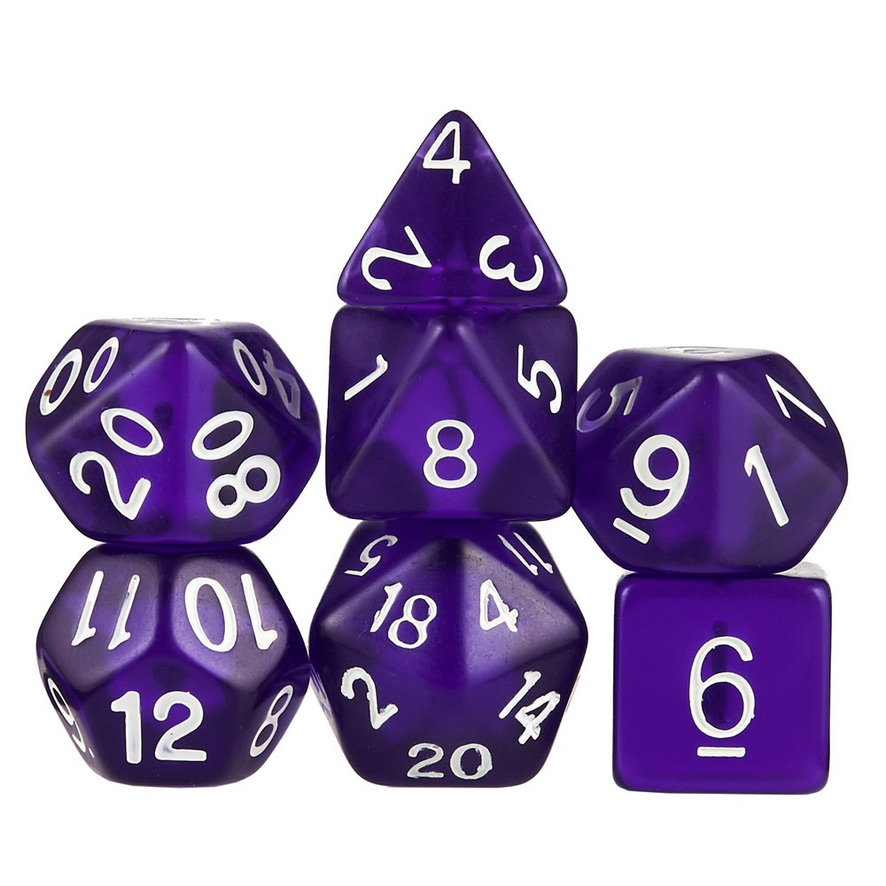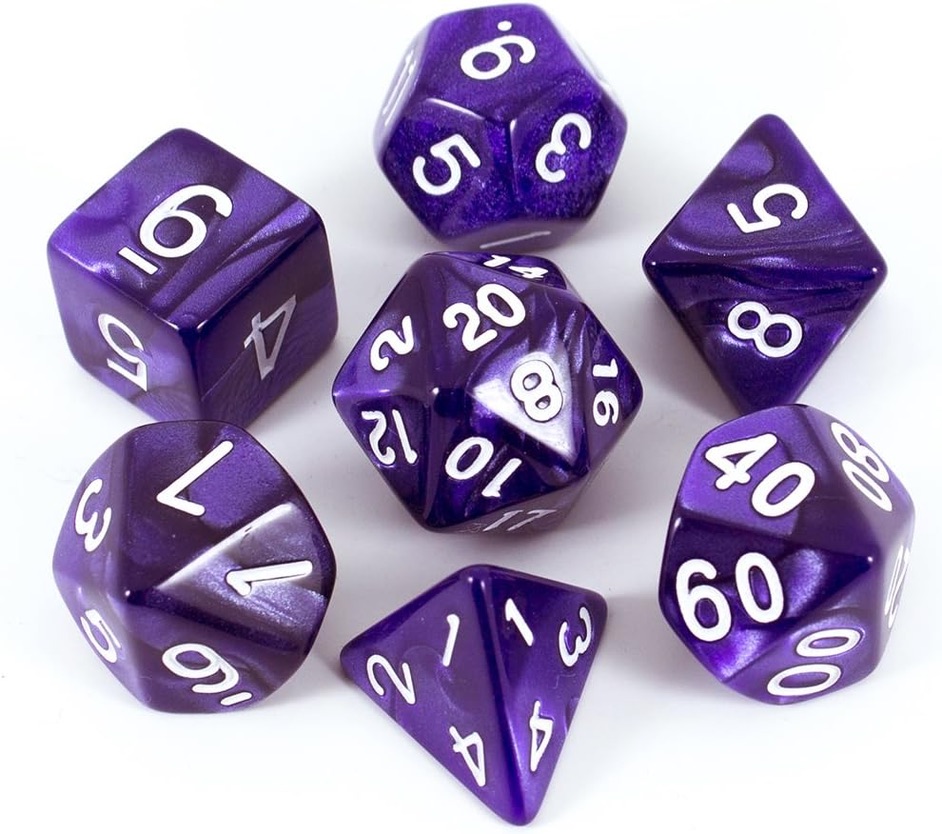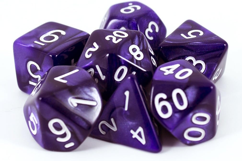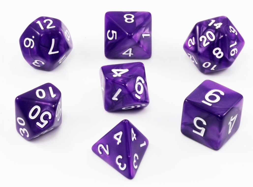 The 7-piece Purple Pearl Dice Set is acrylic based with a pearlized effect making them both attractive and durable, perfect for everyday use. The color is Purple Pearl with easy to read white numbers. If you are a gamer, collect dice, or need dice for a school project, fundraiser or other event, this pack of seven Polyhedral Dice is the perfect solution.