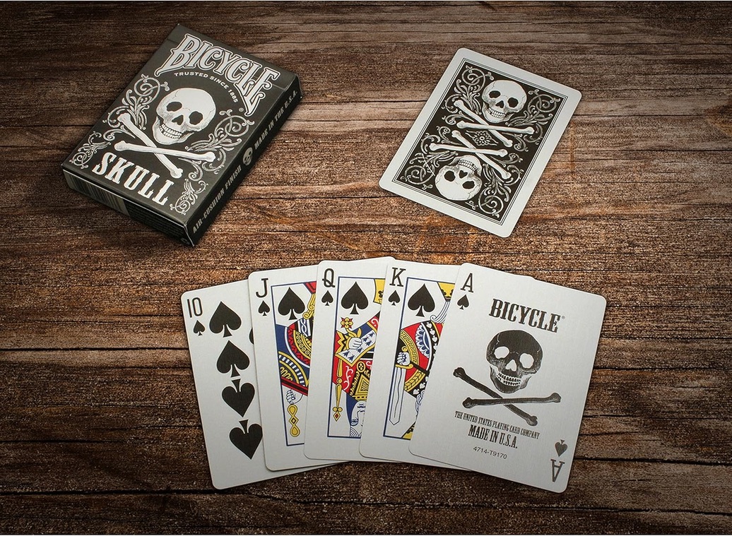 The Skull-themed card backs feature a striking white skull design, offering a unique and edgy aesthetic. The custom art includes original artwork on the card backs and Ace of Spades, enhancing its visual appeal.